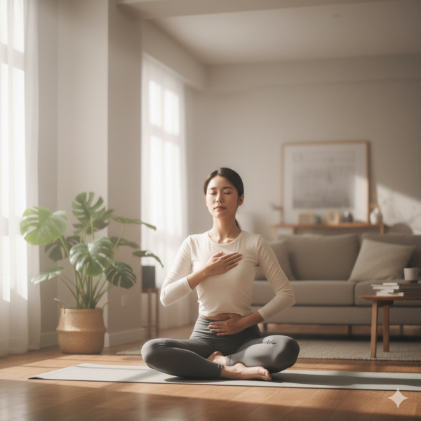 ● 방법: 눕거나(샤바사나) 앉아서 한 손은 가슴, 한 손은 배.